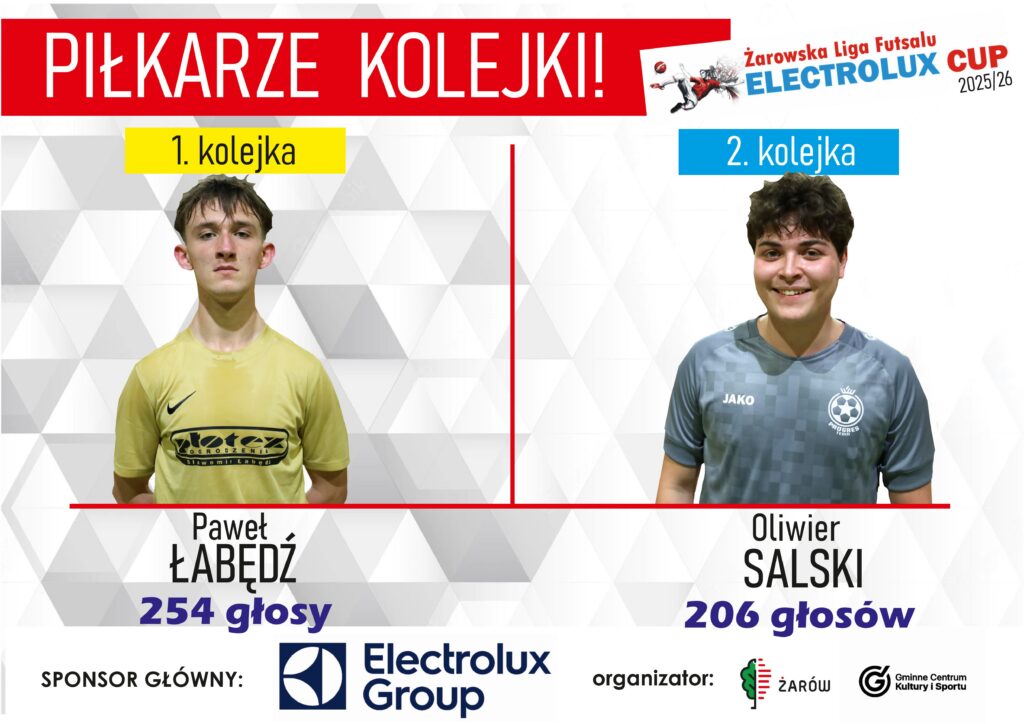 Łabędź i Salski zawodnikami kolejek! 19/12/2025 Autor Krzysztof Wyłączony Dzięki głosom kibiców Paweł Łabędź (Płotex Ciubasa Team) oraz Oliwier Salski (Progres Team) zostali zawodnikami dwóch pierwszych kolejek Żarowskiej Ligi Futsalu Electrolux Cup. Zwycięzcy otrzymają wysokiej klasy sprzęt sportowy, firmy JAKO Polska. SPONSOR GŁÓWNY rozgrywek: Electrolux Żarów Nawigacja wpisu Poprzedni wpisPoprzedni Wybieramy zawodnika 2. kolejki! GŁOSOWANIE!Następny wpisNastępny Po 3. kolejce…